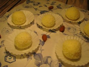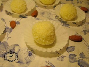 - A következő lépésben vegyünk diónyi darabokat a masszából és tegyünk bele 1-1 szem mandulát, formázzunk golyókat belőle, végül pedig forgassuk meg a maradék kókuszreszelékben.