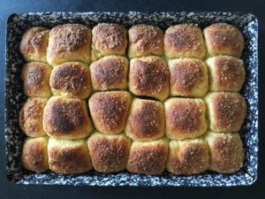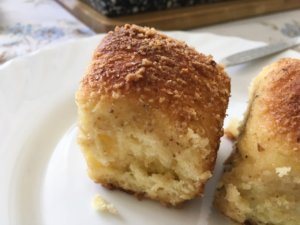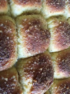 Ha megkelt a tésztánk, csípjünk belőle félmaréknyi darabokat és formáljunk golyócskákat. Ezeket a golyókat alaposan forgassuk meg a cukorral összekevert dióban, és tegyük egy alaposan kivajazott tepsibe, vagy kapcsos tortaformába. Ha készen van, kenjük meg a golyókat olvasztott vajjal és tegyük a 180 fokra előmelegített sütőbe 30 perce.