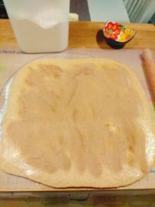 lisztezett felületen téglalapra nyújtjuk, megkenjük 5dkg olvasztott vajjal, fahéjjal elkevert negyedannyi édesítővel (kb. 3 ek) megszórjuk.