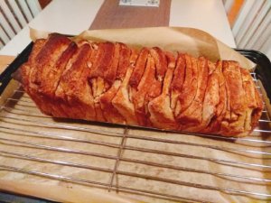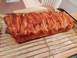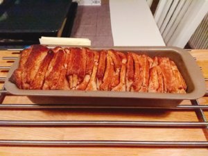 Hosszàban 5 csíkra vàgjuk. Egymàsra rakosgatjuk a rétegeket és ezt vàgjuk tovàbbi 6 részre. Egymás mellé rakva kivajazott kenyérformába rakjuk. Tovàbbi 20 percet kelesztjük. 185 fokos sütőben 35 percig sütjük.