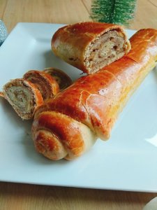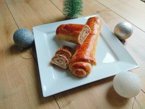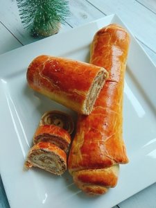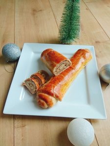A pihentet tésztát átgyúrjuk és 5 egyenlő részre vágjuk. Az első tésztagombócot téglalapra nyújtjuk, egyenletesen megkenjük a gesztenye töltelék 1/5 részével (TIPP: A tölteléket NE a tészta közepére halmozzuk, és onnan kenjük szét, hanem a halmokat inkább kívülről befelé kenjük szét- szerintem így kevesebb az esélye, hogy a tészta szétrepedjen, a töltelék kifolyjon. )
