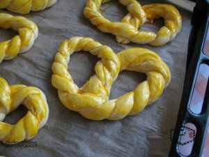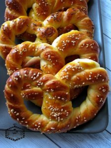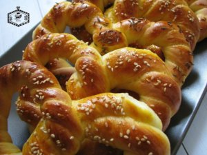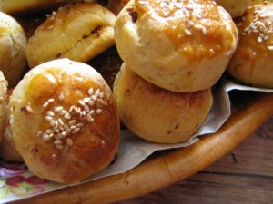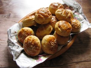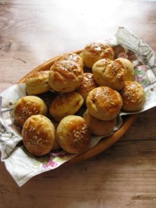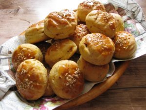 A megkelt tésztát nyújtsuk ki kb. 1,5 cm vastagra. A tetejét egy éles késsel rácsozzuk be és szaggassuk ki tetszőleges méretű pogácsaszaggatóval. Ezután tegyük a pogácsákat sütőpapíros tepsibe és kenjük le a tojásságával, szórjuk meg a szezámmaggal. Előmelegített 190 fokos sütőben 20 perc alatt készre sülnek.