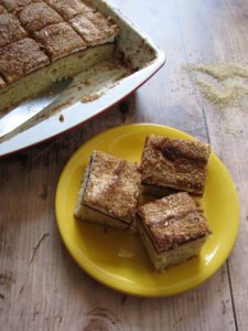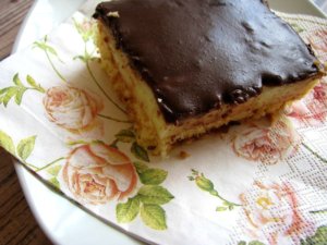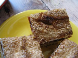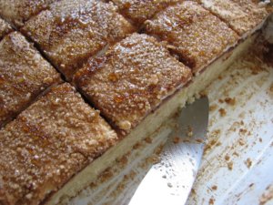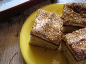 Olajjal vékonyan lekent felületen nyújtsuk négyzet alakúra és vágjuk fel kockákra. A tetejét kenjük le tojással és szórjuk meg szezámmaggal. Előmelegített 170 fokos sütőben 35 perc alatt készül el.